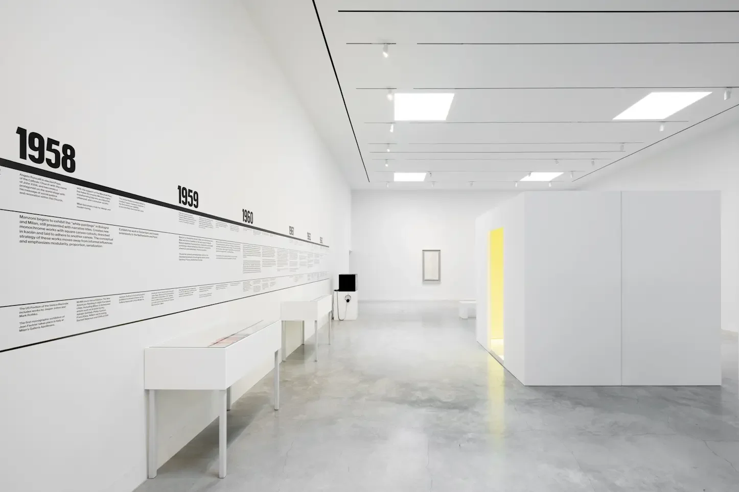 Visitors are welcome to enter each of these rooms, preferably one person at a time. In Stanza fosforescente (Phosphorescent Room), motion sensors trigger a light fixture that emanates a chartreuse glow as viewers step into the room and close the door. It is a gently jarring experience that can subtly alter one’s consciousness for a moment without a lot of bombast. The floors and ceiling of Stanza pelosa (Hairy Room) are covered with a white shag-carpet-like synthetic fur. The stark tactility of this environment could be inviting or repelling, depending on one’s mood. Constructed with the guidance of architect Stephanie Goto, the works were recently donated to Maggazino by the Fondazione Piero Manzoni and Hauser & Wirth. Rounding out this extraordinary exhibition is Base Magica (Magical Bas) consisting of a small platform that visitors can mount to become a work of art for a while—in theory, at least. And particularly useful for Manzoni scholars and enthusiasts is a wall-mounted timeline, several rarely seen videos continually playing on a monitor, and vitrines filled with a wealth of documentary material.