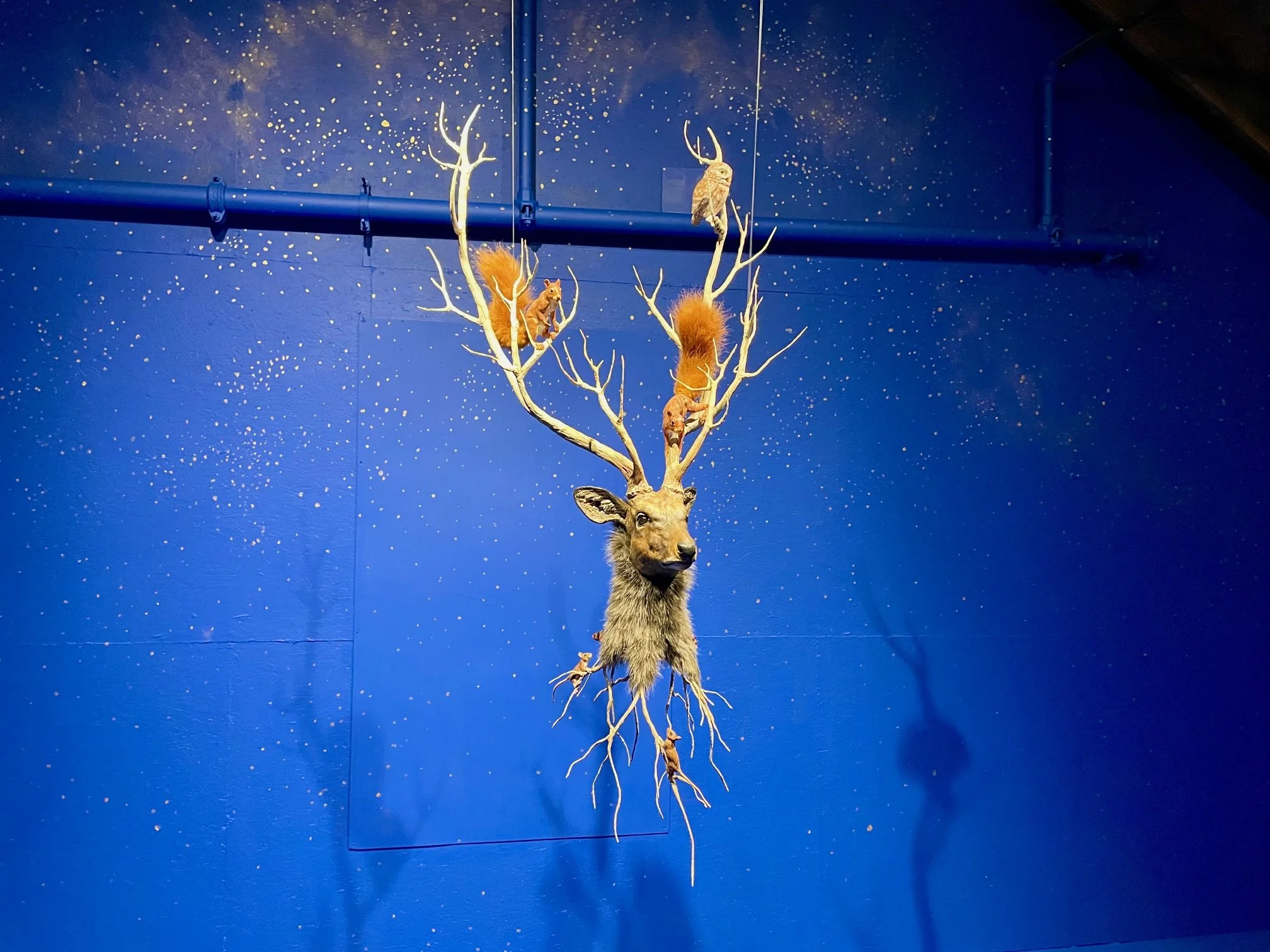 Every viewer will have a personal response to the works on view here, of course, and all the artists here are clearly accomplished. For me, though, two displays were the most outstanding and unforgettable. Kim Mullis’s series of abstract paintings on canvas tarps, stretched with long strings attached to grommets, were unapologetically gorgeous. They hint at Native American motifs and have the look of stretched hides. The paintings, however, are hard-edge, hallucinatory compositions made of colorful swirling forms and connected geometric shapes with which Mullis imparts a unique and exhilarating cosmology. The exhibition culminates in an arresting display in a celestial, blue-painted room at the uppermost gallery filled with Deborah Simon’s sculptures of deer, rabbits, squirrels and birds, made of polymer, epoxy, crystal beads, embroidery and paint. The installation conjures a mythological realm inhabited by forest dwellers while also addressing the ever-volatile relationship these creatures have with humankind. —David Ebony