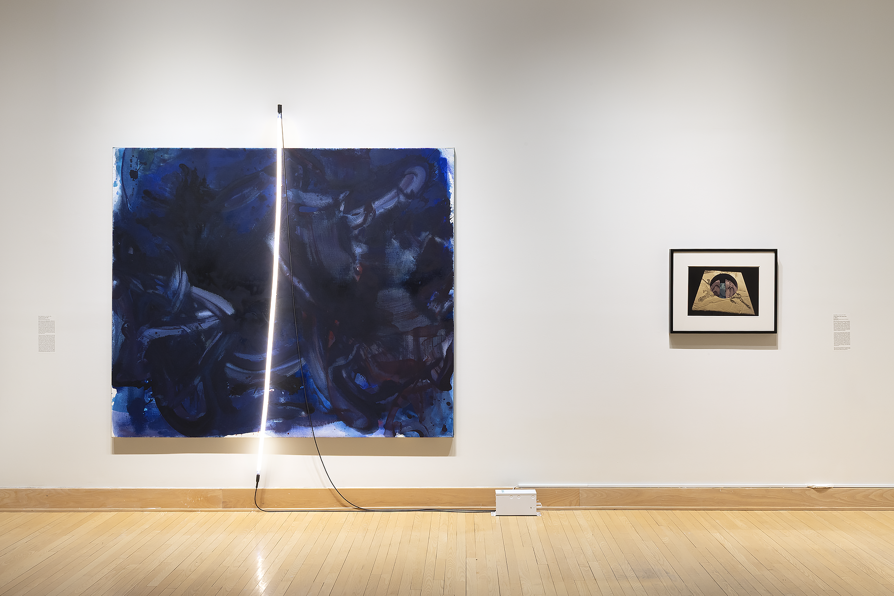 Installation view of Watts per Lumen at The Samuel Dorsky Museum of Art, showing works by Mary Weatherford (left), and Darrel Ellis (right); courtesy The Samuel Dorsky Museum of Art. Photo Mindy McDaniel.