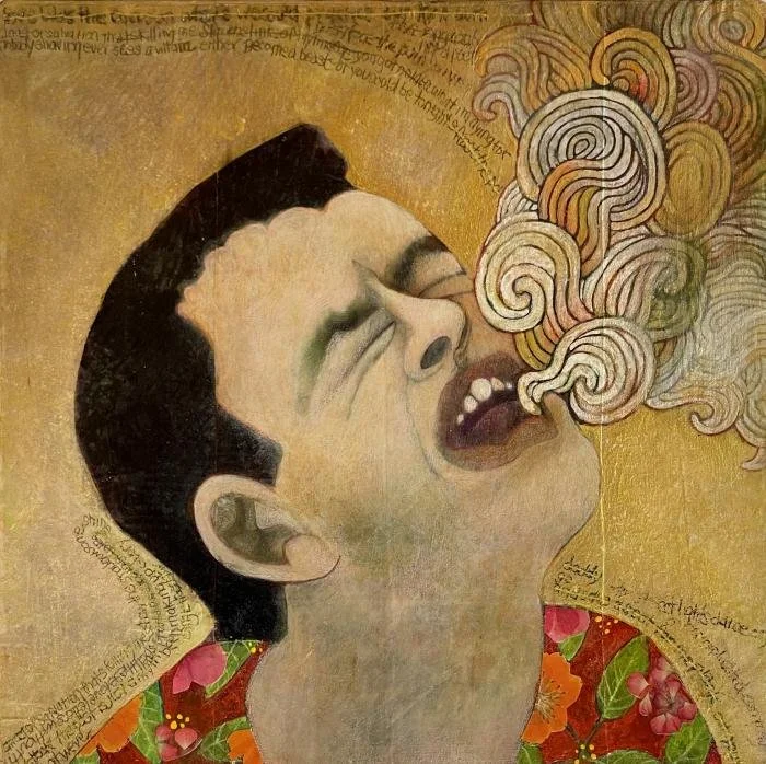 In her meticulously rendered painted portraits, Deirdre O’Connell shares with viewers an intimate relationship with each of her subjects that transcends their mere physical resemblance. The artist, also a Tony-award winning stage actress, creates images of friends and work colleagues in the midst spontaneous gestures or activities that highlight their fierce individuality and unique personae. For instance, the quartet of striking portraits (intended for an album cover) of her musician and performer friend Bobby Moreno, suggests moments of performative action, like singing. In Bobby #3, the act of vocalization is rendered by means of elaborate patterns of spiraling lines that emanate from the mouth of the figure’s expressive upturned face. Meandering lines of scrawled text along the contours of the head and shoulders as well as the upper edge of the panel are borrowed from the lyrics of his songs. In Bobby #2, small, identical portrait heads are placed inside of the eye sockets of the face as if to suggest the multiple personalities that performers are routinely required to summon for their audience.
