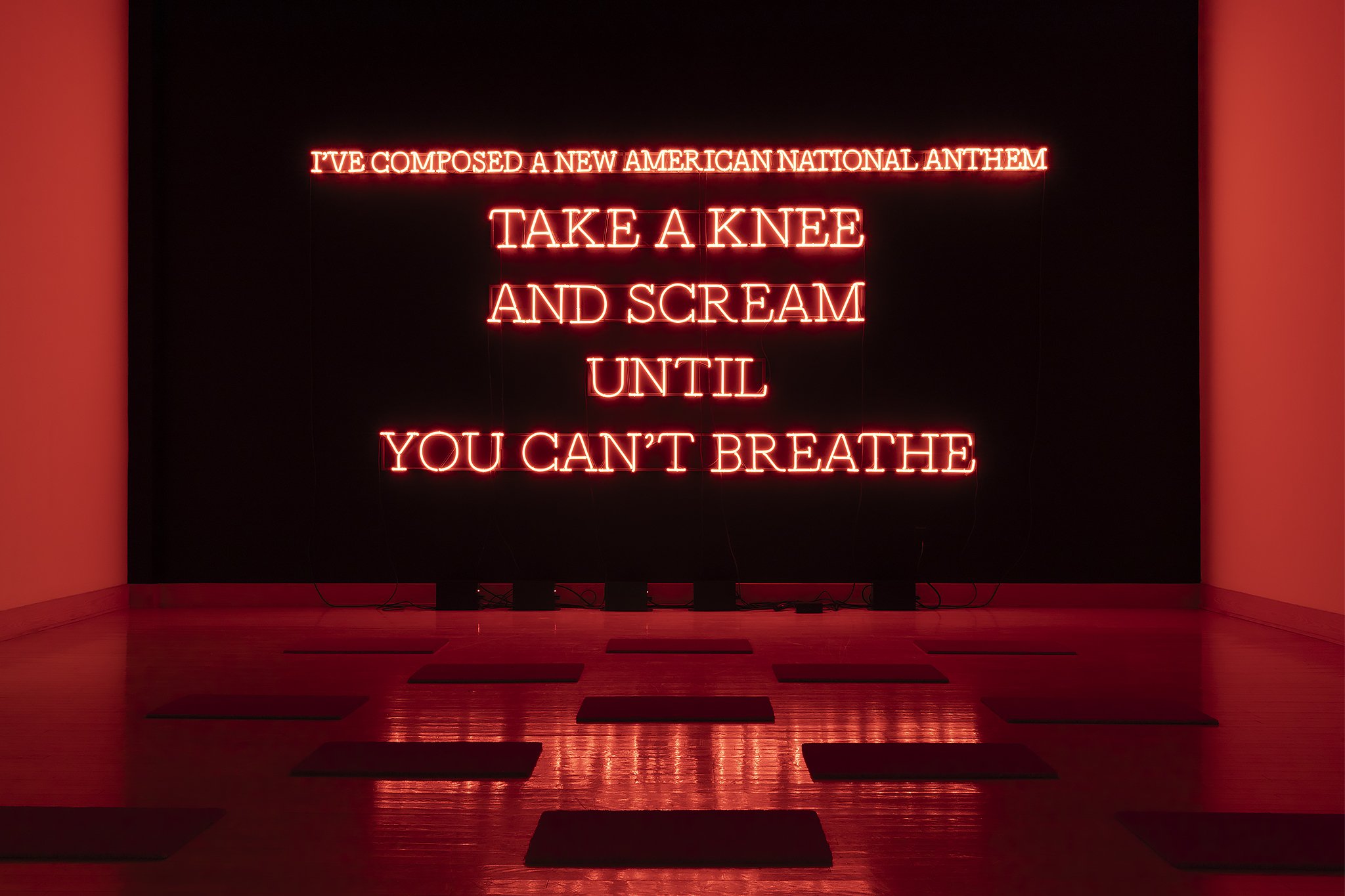 Watts per Lumen is an idiosyncratic but exhilarating survey exploring the use of light in recent art. Organized by museum curator Sophie Landres, the exhibition was inspired by the Dorsky’s recent acquisition of works by Glenn Ligon, including pieces related to his celebrated neon work, Warm Broad Glow (2005), in MoMA’s collection, with the wall-mounted neon lettering “negro sunshine” painted black on the front and with stark white light glowing against the wall behind. The Dorsky’s two-dimensional Warm Broad Glow (Reversed), 2008, is an image of the original sculpture printed as a negative. As Landres notes, “Translating it into a medium in which light and dark switch positions continues the chromatic role-reversal initiated by painting the neon letter fronts black. The gesture further questions cultural habits that treat whiteness like an invisible original state against which blackness is seen as difference.” A similarly politically provocative and arresting work here, Neon American Anthem (red), 2023, by indigenous American artist Nicholas Galanin, is one of the exhibition’s highlights. Occupying one large gallery, the installation features a wall with glowing red neon texts in all caps reading, “I’ve composed a new American National Anthem / Take a knee and scream until you can’t breathe.” The words are an amalgam of Black Lives Matter slogans referencing the chokehold murder of Eric Garner at the hands of a New York police officer in 2014, and NFL quarterback Colin Kaepernick’s gesture of kneeling during the national anthem to protest racial injustice and police brutality. Galanin has provided floor mats on which gallery visitors are invited to kneel and voice their own protests by screaming at the top of their lungs until they cannot breathe.