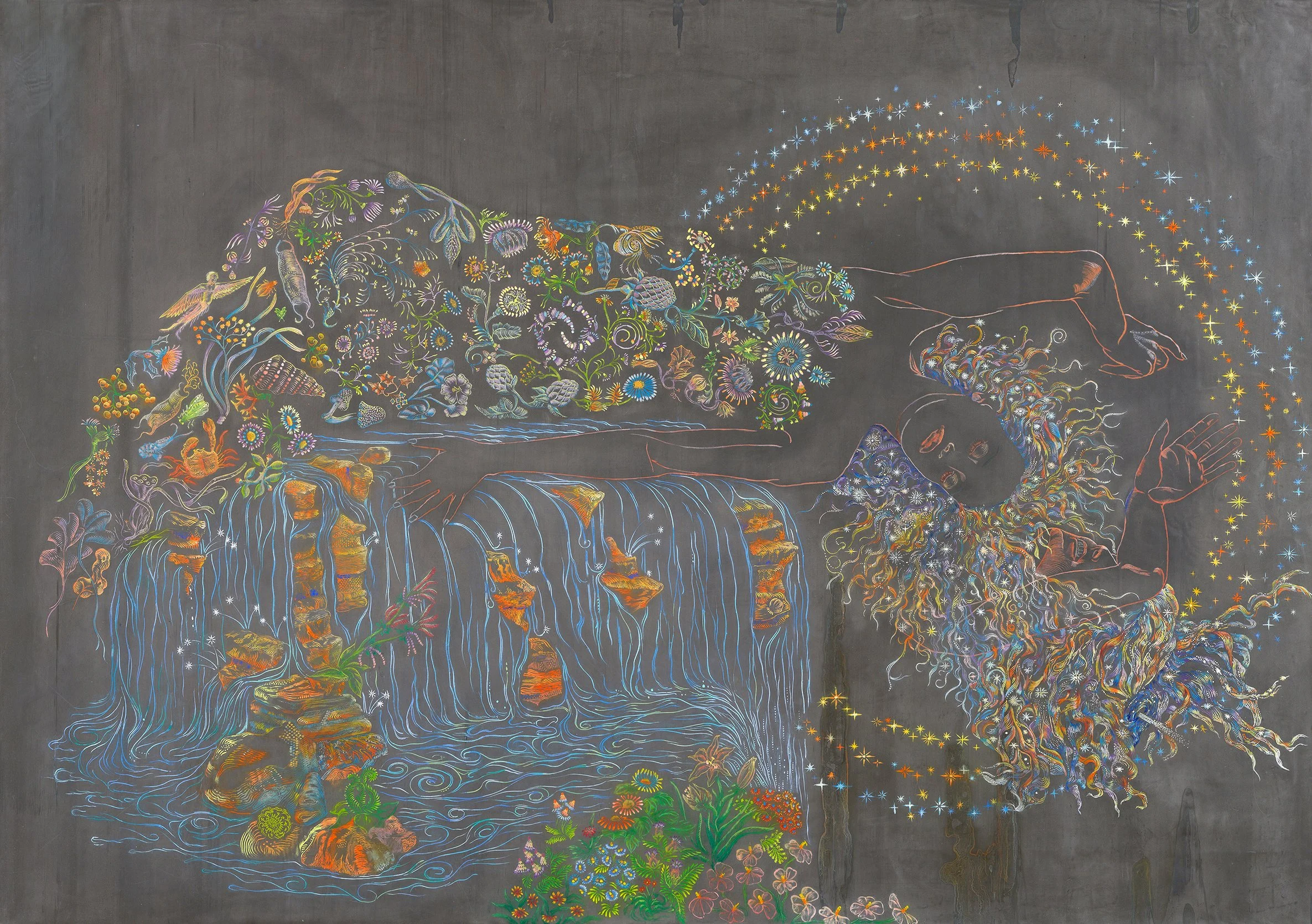 Vega’s exploration of the heavens in Anima Mundi reaches beyond cosmic bodies. Deities populate the exhibition as humans and animals composed of abundant earthly beauty, as if to suggest that even gods are subject to the natural caprices of growth and decay. Gea (Gaia), 2025, imagines Mother Earth embodied as a tapestry of exotic flowers, insects, crustaceans, and stardust, lying in repose as her glistening mane cascades alongside the waterfall she sleeps upon. The verdant horse-god profiled in Levi (2025) is formed of a similar magic, nuzzling its shirtless, jorts-sporting friend with a muzzle of densely braided flora, wild as the meadow underfoot. The show’s smallest works appear like scientific studies of otherworldly blossoms, isolated against the unadorned lead ground with Latinate labels explaining what’s what. There is an entire universe contained in Vega’s exhibition—from the epic galaxies whirling with cultural idols to the critters perched on the petals of these enchanting flowers—held together by the singular and highly improbable joy of being alive. — Matt Moment