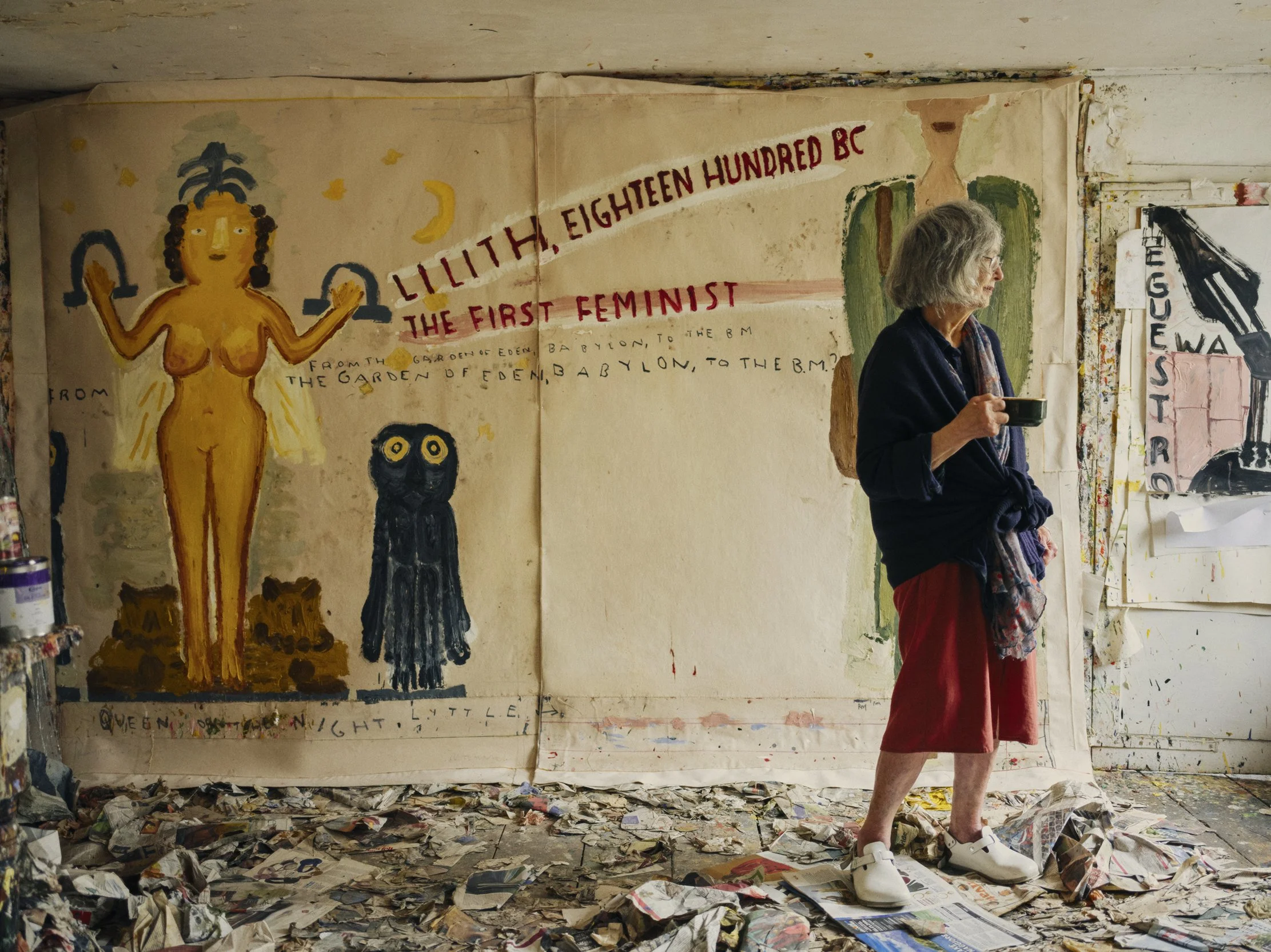 British painter Rose Wylie in her studio with Lilith and Gucci Boy.
