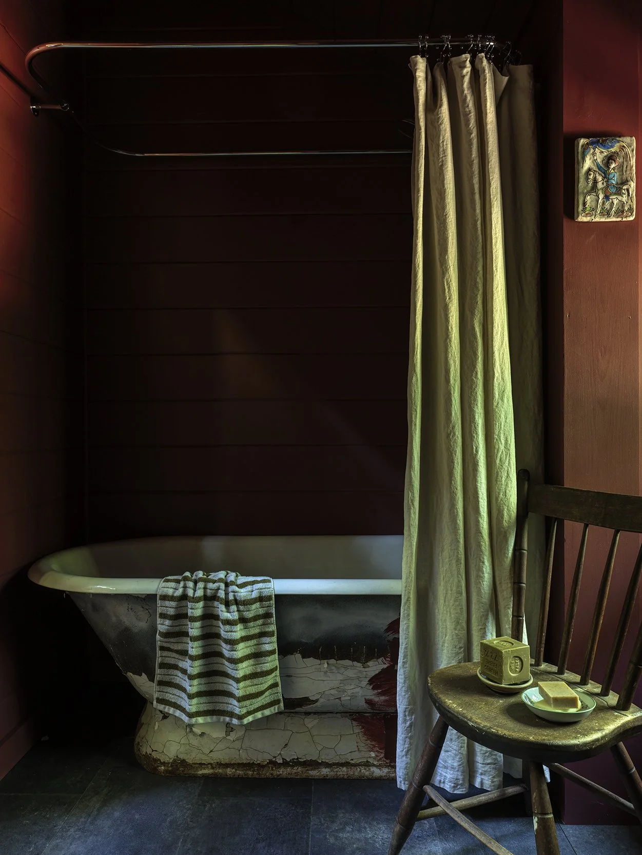 The result was that Rousseau sourced nearly everything locally (“pieces that could feel a bit rougher but still be sophisticated”), including a cast iron tub with a burst of spray paint that Rousseau saw on the side of the road at a place called Treasures and Trash Barn. Along with these local finds, the rooms are studded with objects original to the property itself. “Garance was like, ‘I’d really love a clock,’” LaStaiti told me, “and there happened to be this old clock that had been in the house when I bought it and wasn’t in use, but I liked it, so I didn’t throw it out, and it turned out it was from Tiffany and had Jim Modisette’s initials engraved.” The story LaStaiti had been told was that “Jim loved the guesthouse, got really excited about opening it up for guests every summer. After he died, it just sat until the animals began to take it back.”